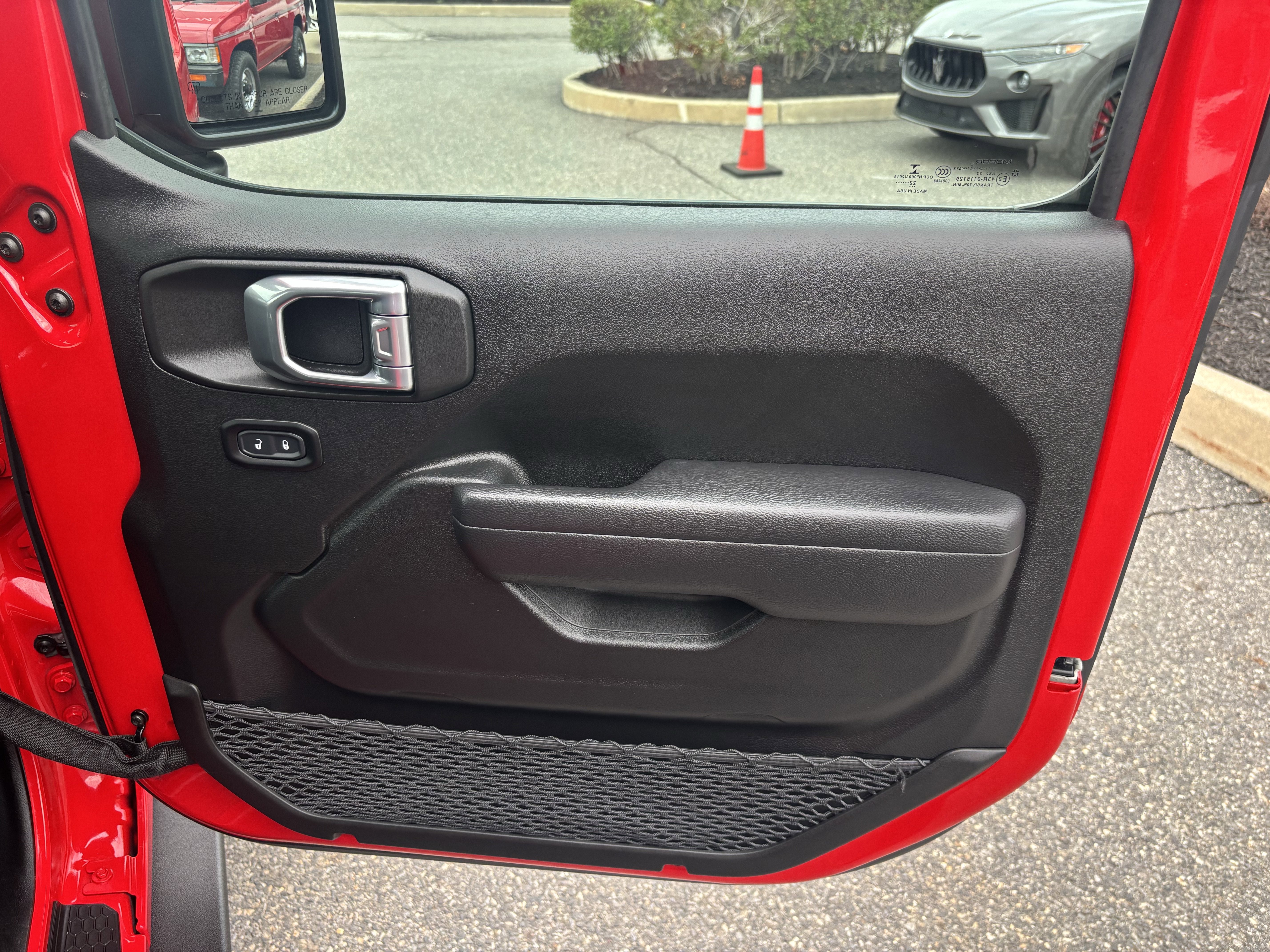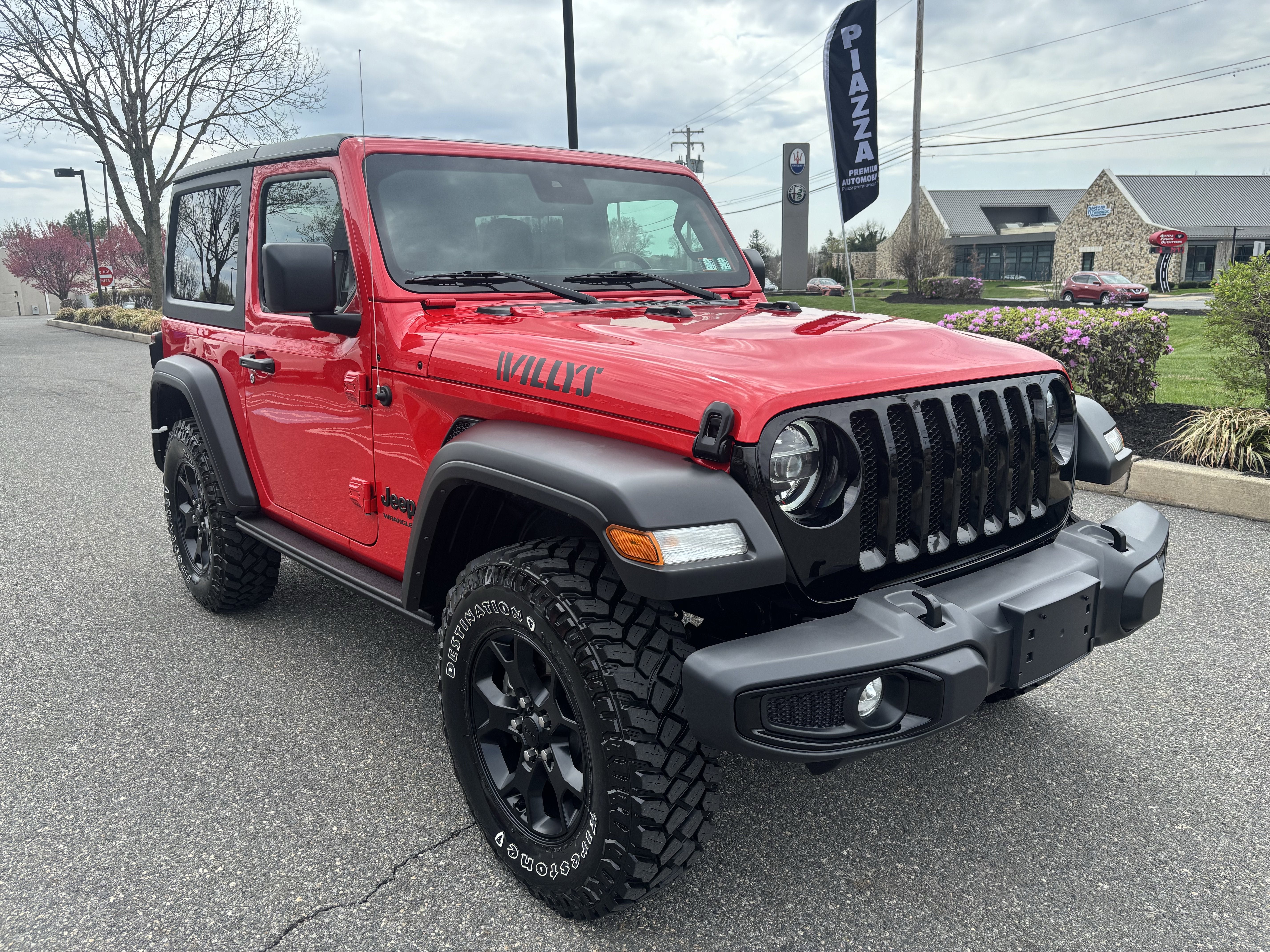 2022 Jeep Wrangler Willys 4X4 finished in Firecracker Red Clearcoat over Black Interior. It features a 240 Amp Alternator, 4-Wheel Disc Brakes, 4-Wheel Drive Swing Gate Decal, 7 & 4 Pin Wiring Harness, 700 Amp Maintenance Free Battery, 8 Speakers, 8.4 Radio & Premium Audio Group, 8.4 Touchscreen Display, 97 MPH Vehicle Max Speed Calibration, ABS brakes, Advanced Brake Assist, Advanced Safety Group, Air Conditioning, Air Conditioning w/Auto Temperature Control, Air Filtering, Alpine Premium Audio System, AM/FM radio, Anti-Spin Differential Rear Axle, Apple CarPlay, Auto High Beam Headlamp Control, Auto-Dimming Rear-View Mirror, Automatic Headlamps, Auxiliary Switches, Black 3-Piece Hard Top, Black Grille, Black Trail Rated Badge, Blind Spot & Cross Path Detection, Brake assist, Bridgestone Brand Tires, Class II Receiver Hitch, Cluster 7.0 TFT Color Display, Cold Weather Group, Compass, Convenience Group, Deep Tint Sunscreen Windows, Delay-off headlights, Driver door bin, Driver vanity mirror, Dual front impact airbags, Dual front side impact airbags, Electronic Stability Control, Emergency communication system: SiriusXM Guardian, Emergency/Assistance Call, Engine Oil Cooler, For Details, Visit DriveUconnect.com, For More Info, Call 800-643-2112, Freedom Panel Storage Bag, Front 1-Touch Down Power Windows, Front anti-roll bar, Front Door Locks 2-Door Passive Entry, Front fog lights, Front LED Fog Lamps, Front reading lights, Full Speed Forward Collision Warning Plus, Global Telematics Box Module (TBM), Google Android Auto, GPS Antenna Input, GPS Navigation, HD Radio, Heated Front Seats, Heated Steering Wheel, Injection Molded Black Rear Bumper, Integrated Center Stack Radio, Integrated roll-over protection, Integrated Voice Command w/Bluetooth®, Leather Wrapped Steering Wheel, LED Headlamp & Fog Lamp Group, LED Premium Reflector Headlamps, LED Taillamps, Low tire pressure warning, Matte Black Jeep Badge, Mold In Color Bumper w/Gloss Black, MOPAR All-Weather Floor Mats, MOPAR Cold Air Intake, MOPAR Doors Off Mirror Kit, MOPAR Grab Handle Kit, MOPAR Plastic Door Sill Guards, No Soft Top, Normal Duty Suspension, Occupant sensing airbag, Off-Road Info Pages, ParkSense Rear Park Assist System, ParkView Rear Back-Up Camera, Power Heated Mirrors, Power steering, Quick Order Package 23W Willys, R1234YF A/C Refrigerant, Radio data system, Radio: Uconnect 4C Nav w/8.4 Display, Rear anti-roll bar, Rear Window Defroster, Rear Window Wiper/Washer, Remote Keyless Entry, Safety Group, Security Alarm, SiriusXM Radio Service, SiriusXM Satellite Radio, SiriusXM Traffic Plus, SiriusXM Travel Link, Speed control, Speed Sensitive Power Locks, Steering wheel mounted audio controls, Sun Visors w/Illuminated Vanity Mirrors, Technology Group, Traction control, Trailer Tow & HD Electrical Group, Universal Garage Door Opener, USB Host Flip, Wheels: 17 x 7.5 Moab Black Aluminum, Willys, and a Willys Hood Decal.